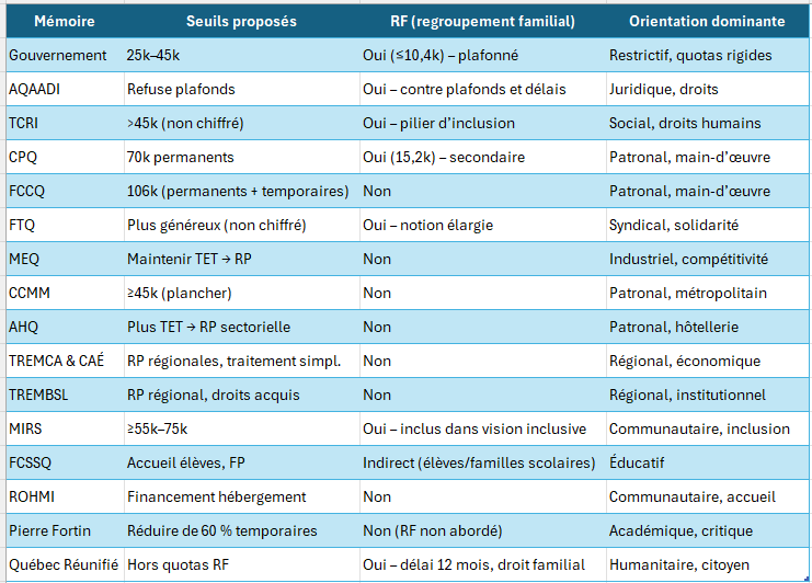À l’échelle sectorielle, l’Association Hôtellerie du Québec (AHQ) insiste sur la nécessité de travailleurs temporaires dans l’industrie et souhaite des passerelles vers la résidence permanente pour des postes essentiels (mémoire AHQ). Enfin, les voix régionales de la Chaudière-Appalaches (TREMCA & CAÉ) et du Bas-Saint-Laurent (TREMBSL) défendent une immigration adaptée aux réalités locales, avec une facilitation de la résidence permanente pour ceux déjà établis, la régionalisation et la francisation comme piliers (mémoire TREMCA & CAÉ). Dans tous ces cas, le regroupement familial est absent ou traité comme secondaire.