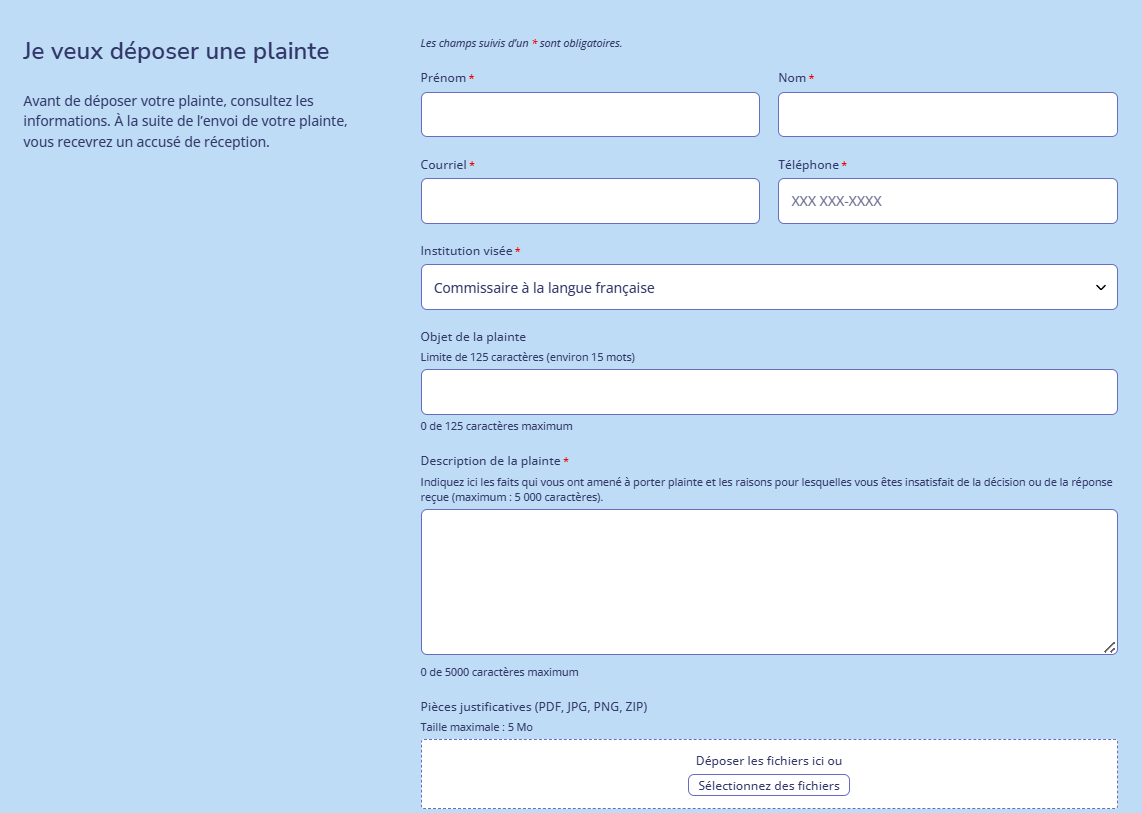 Je souhaite déposer une plainte concernant le plus récent rapport du Commissaire à la langue française portant sur l’intégration des personnes immigrantes. Plusieurs éléments de ce document soulèvent des préoccupations sérieuses quant à la rigueur méthodologique, à l’exactitude de certaines affirmations et à la conformité du rapport au mandat du Commissaire.